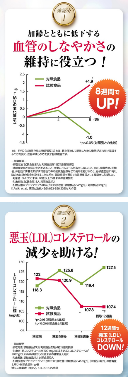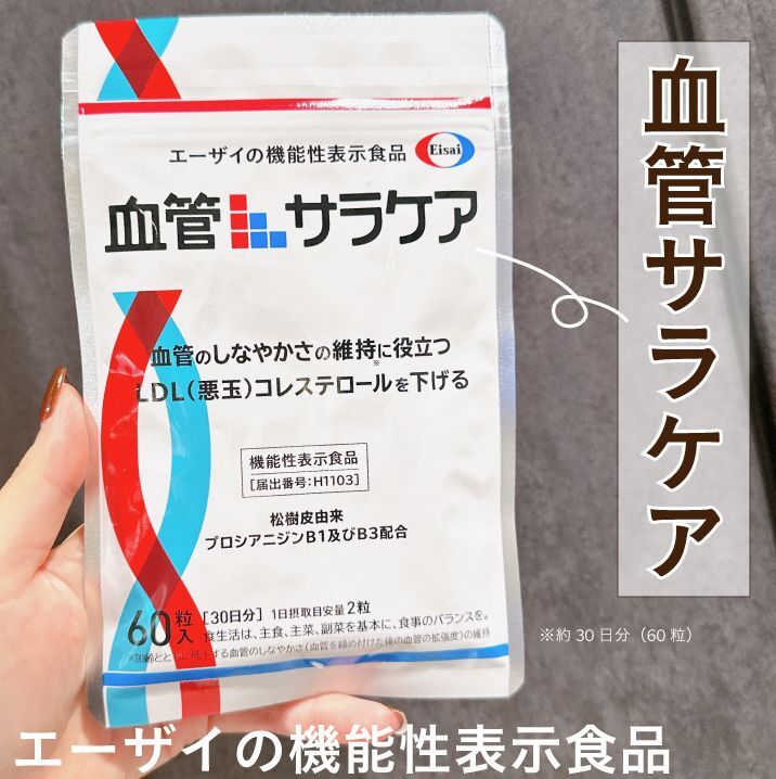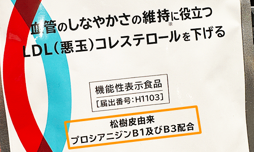 【届出表示】本品には、松樹皮由来プロシアニジンB1及びB3が含まれます。松樹皮由来プロシアニジンB1及びB3には、加齢とともに低下する血管のしなやかさ(血管を締め付けた後の血管の拡張度)の維持に役立つ機能、LDL(悪玉)コレステロールを下げる機能があることが報告されています。届出番号:H1103